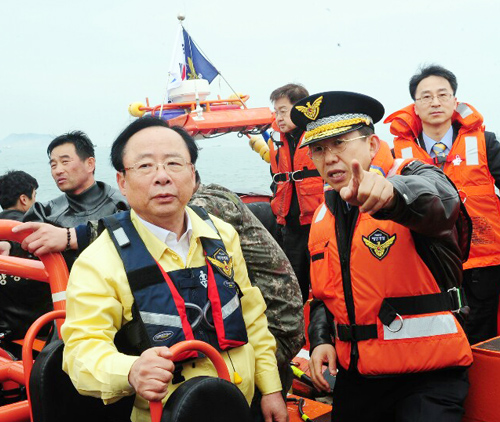 세월호 침몰 사고 인근 해상에서 김석균 해경청장이 이주영 해수부 장관에게 수색 및 구족작업에 대해서 설명하는 모습