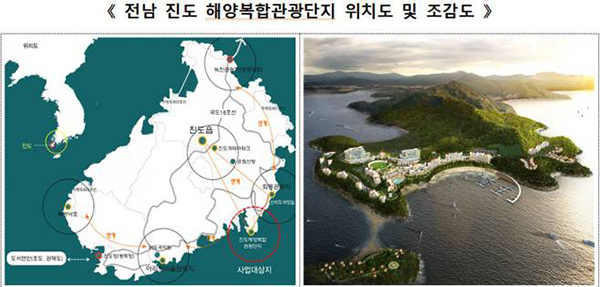 진도해양복합관광단지 사업은 오는 2022년까지 국비 92억원과 지방비 3억원, 민간 사업비 3508억원이 투입돼 호텔과 콘도, 진도전통문화체험관, 로컬푸드 판매장과 공연장 등을 건립할 예정이다.