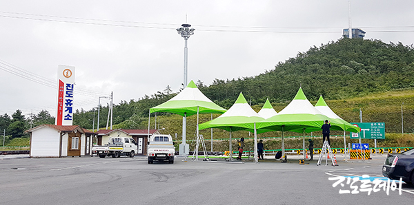<6월 30일 오후 진도대교 녹진 휴게소에 코로나19 발열 체크장 설치 작업이 진행되고 있는 모습>