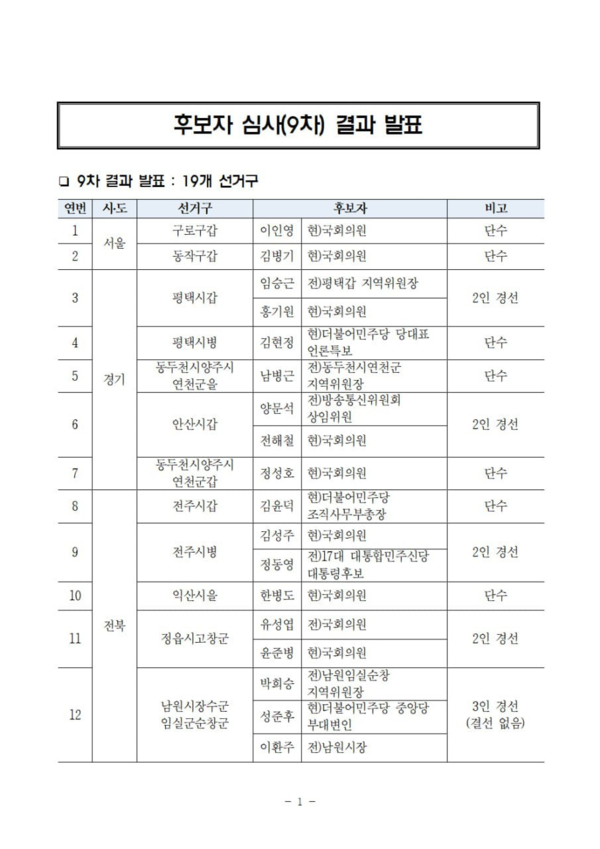 더불어민주당 공천관리위원회는 1일 오후 2시, 9차 심사 결과를 발표 했다.<자료 참조>