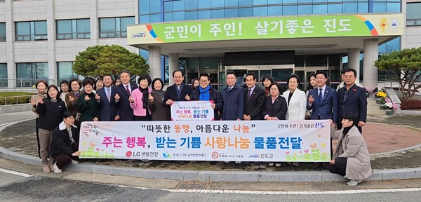 지난 29일 오후, 진도군청 현관 앞에서 대중소기업 농어업협력재단(사무총장 김영환)의 기탁식이 개최 됐다.