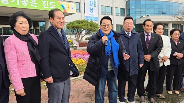 더불어민주당 박지원 국회의원은 격려말을 통해서 “재단측에서 우리 진도에 전달 하겠다고 해서 ‘감사하다’ 그러면 진도군에 연락 하시라고 말했지, 제가 알선한 것은 아닙니다”라며 “제가 알선하면 제3자 뇌물죄가 됩니다. 선거법에 위반 됩니다. 오해하지 마시기 바란다”고, 말해 주변에 웃음을 선사 했다.