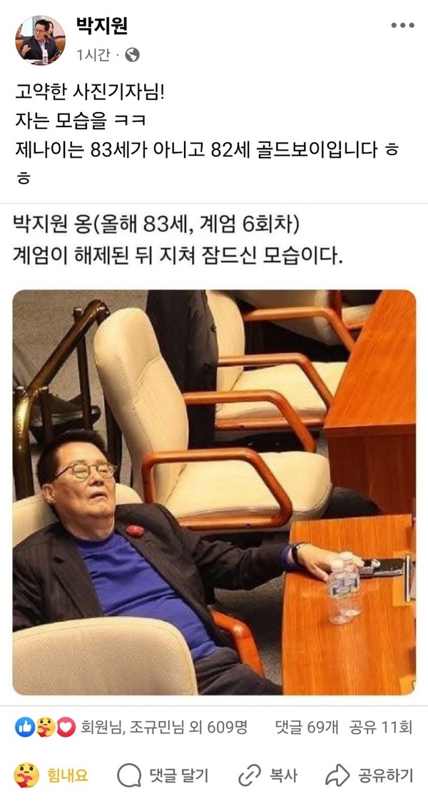 박 의원은 지난 4일 새벽 비상 계엄이 해제된 이후 국회 본회의장에서 잠든 모습이 포착돼 화제가 되고 있다.