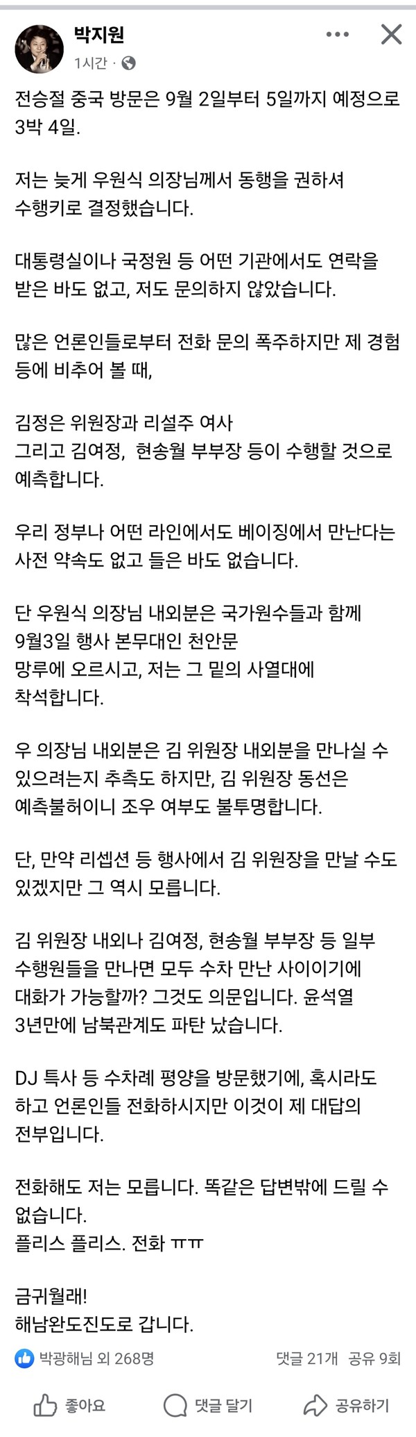 박지원 의원은 29일 오후, 자신의 SNS에 올린 글을 통해 중국 전승절 방문 소식과 입장을 밝혔다.