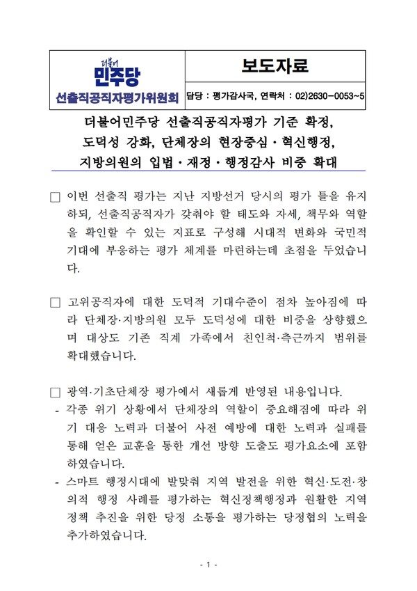 민주당은 지난 17일 당무위원회를 열고, 단체장·지방의원 평가 기준을 최종 의결 했다. 이번 평가의 핵심은 ‘도덕성 검증 강화’와 ‘위기 대응 리더십’이다.