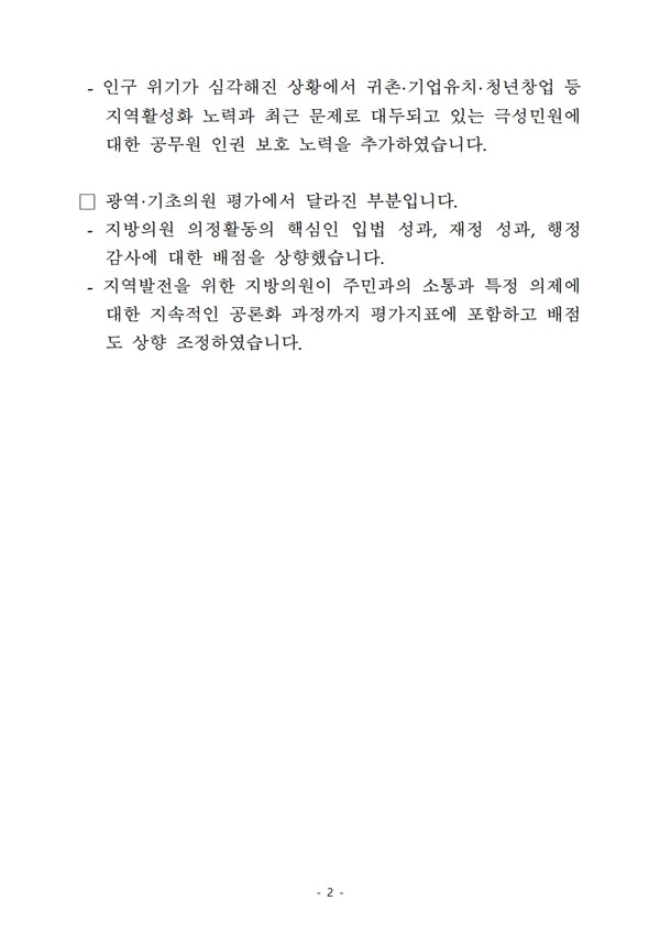 지방의원 평가도 도덕성과 의정 활동, 지역 활동 등 1,000점 만점으로 세분화 됐으며, 주민 소통과 입법 성과의 비중이 대폭 강화 됐다.