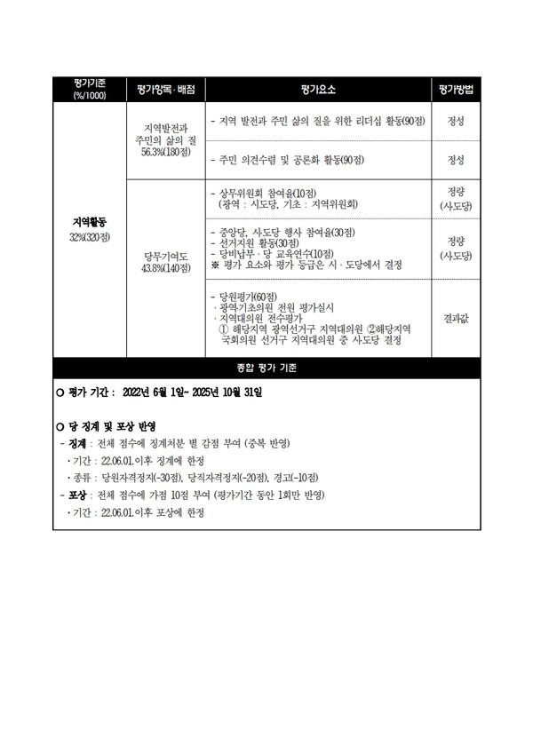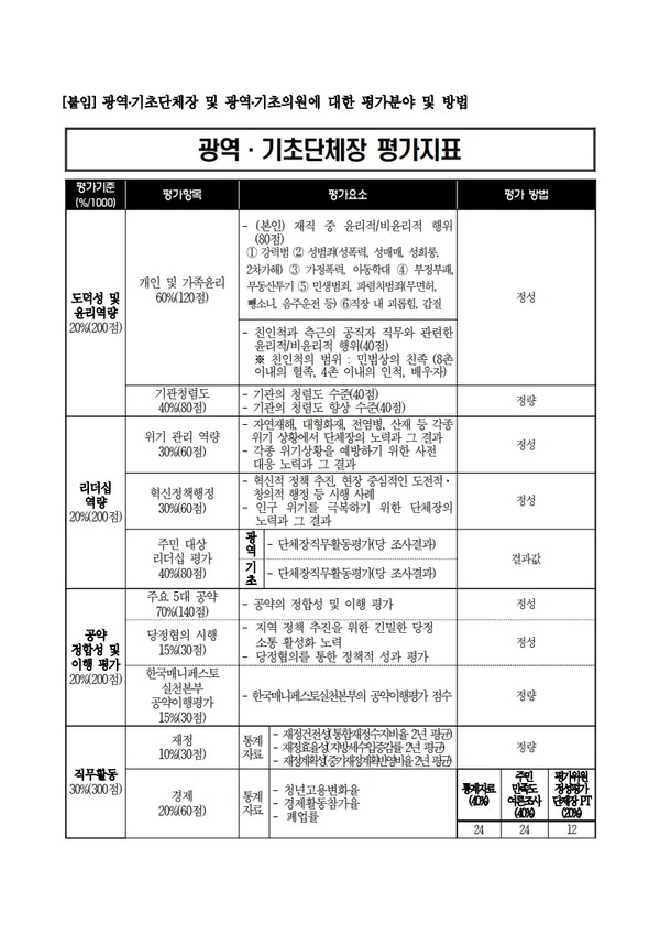 민주당은 광역·기초단체장을 여론조사로 직무평가와 삶의 질 기여도 등을 평가 한다. 이는 민심과 당심 모두가 변수가 되는 구조다.