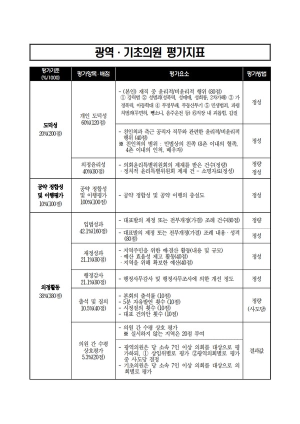 반면, 광역·기초의원은 의정 활동 평가에 동료 평가가 반영 된다. 의원 간 관계와 의회내 분위기가 성적에 직결될 수 있어 ‘보이지 않는 정무전’이 벌어지는 모습이다.